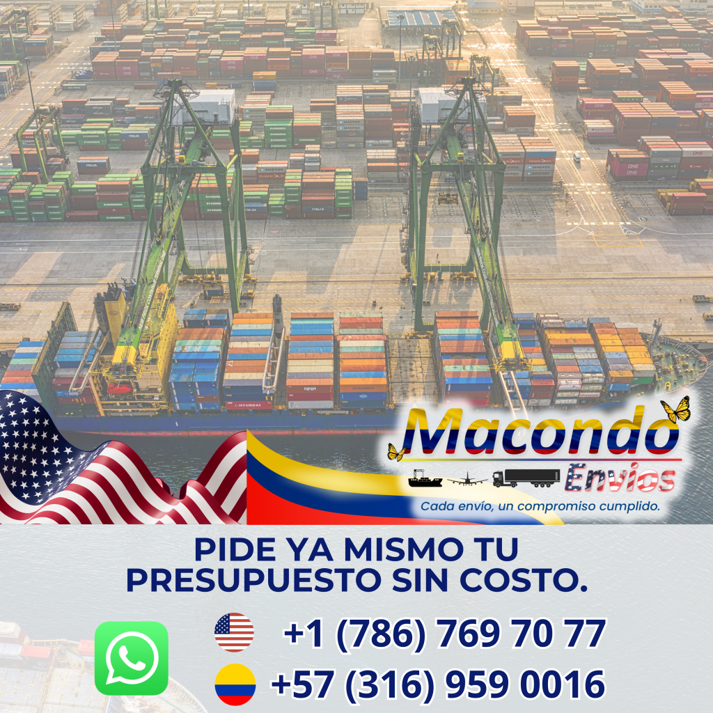 Macondo Envíos es una empresa de envíos internacionales que ofrece transporte marítimo y aéreo desde Estados Unidos a Colombia, especializada en menajes, mercancías y carga comercial, con envíos seguros, confiables y cumplidos.